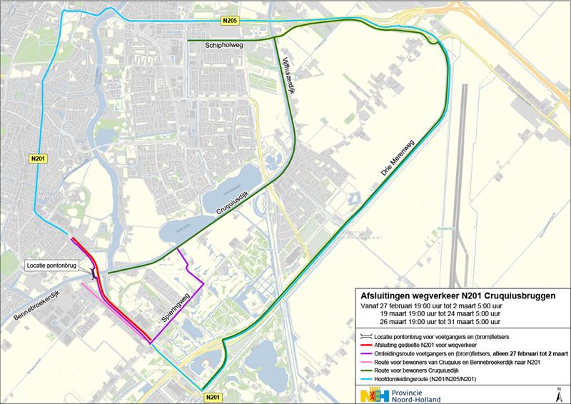De vernieuwing van de Cruquiusbruggen is bijna klaar. Eind maart 2026 zijn alle werkzaamheden afgerond. Voor de afronding zijn drie tijdelijke afsluitingen nodig. Tijdens deze periodes is de N201 volledig afgesloten voor autoverkeer in beide richtingen tussen de Spieringweg (Haarlemmermeer) en de Javalaan (Heemstede).